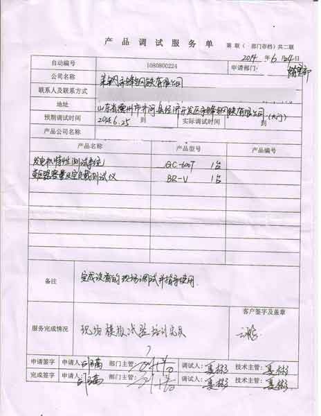 2014-10-30 山東萊鋼永鋒鋼鐵有限公司 進行調試服務,調試產品:CYBR-V變壓器容量及空負載測試儀 CYGC-600T發電機特性測試系統