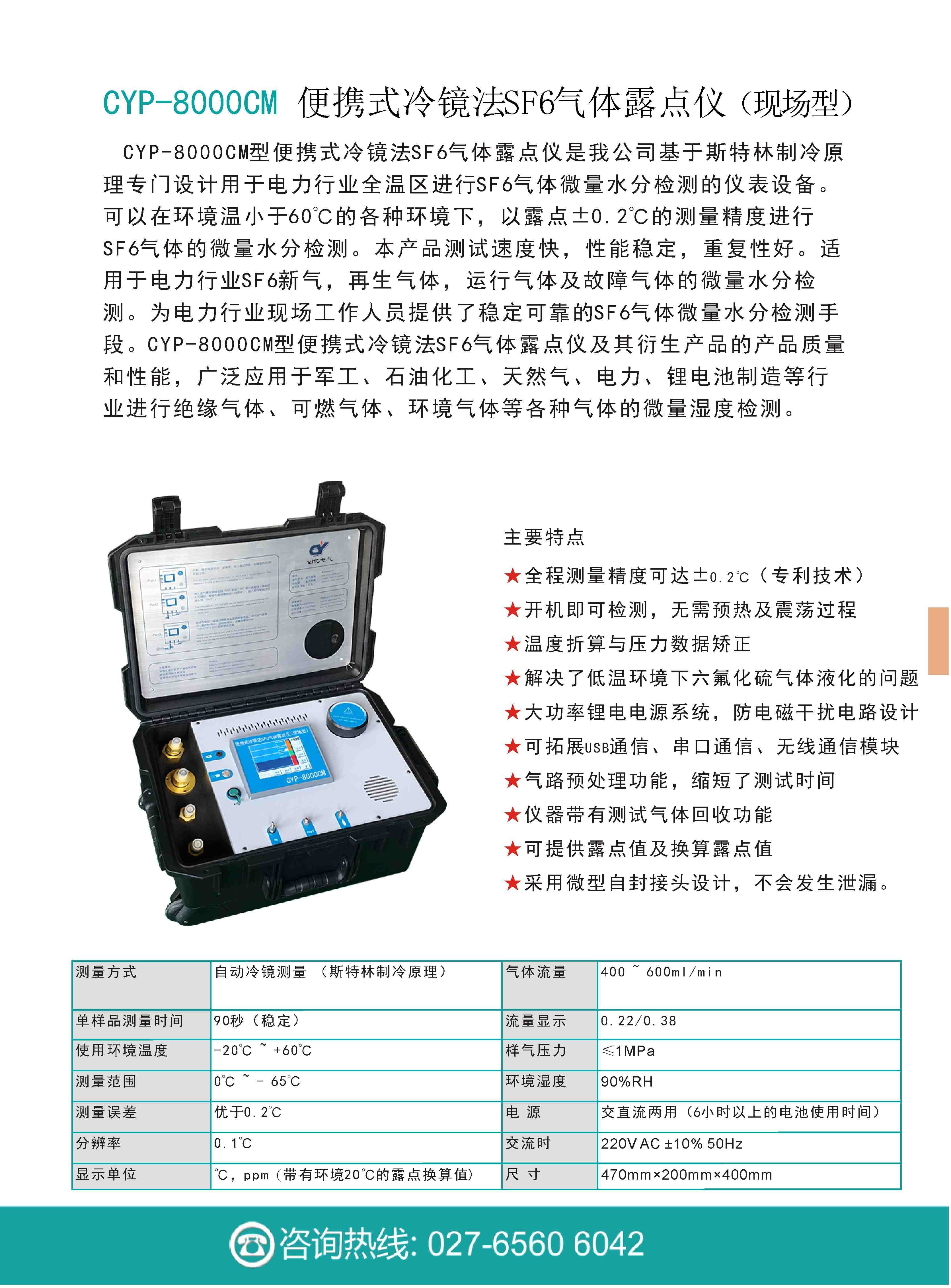 便攜式冷鏡法SF6氣體露點儀是我公司基于斯特林制冷原理專門設計用于電力行業全溫區進行SF6氣體微量水分檢測的儀表設備。可以在環境溫小于60℃的各種環境下,以露點±0.2℃的測量精度進行SF6氣體的微量水分檢測。本產品測試速度快,性能穩定,重復性好。適用于電力行業SF6新氣,再生氣體,運行氣體及故障氣體的微量水分檢測。為電力行業現場工作人員提供了穩定可靠的SF6氣體微量水分檢測手段。便攜式冷鏡法SF6氣體露點儀及其衍生產品以其優異的產品質量和性能,廣泛應用于軍工、石油化工、天然氣、電力、鋰電池制造等行業進行絕緣氣體、可燃氣體、環境氣體等各種氣體的微量濕度檢測。