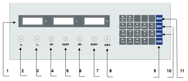 10— 額定電壓選擇按鍵。該按鍵必須和上圖中標(biāo)號為9的按鍵組合使用,使設(shè)定的電壓與實際所測量的電子式電流(或電壓)互感器額定二次電壓相一致。